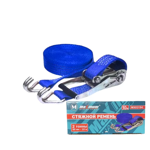 Ремни для крепления груза 10 метров с храповым механизмом и крюками от " MAXIMUM QUALITY TOOLS" созданы для фиксации багажа и крепления небольших грузов (коробки, мебель и т.д.) к верхнему или прицепному багажнику легкового автомобиля, фургона и других транспортных средств. Прочная лента из полипропиленовых нитей двойного плетения шириной 50 мм не деформирует фиксируемый груз и имеет относительное удлинение не более 7 % при максимально допустимой рабочей нагрузке. Храповик стяжного багажного ремня имеет пластиковое покрытие и оснащен удобным механизмом разблокировки. Надежный зубчатый механизм предотвращает ослабление натяжения ремня во время движения транспорта. Крюки и храповый механизм стяжных багажных ремней выполнены из прочной стали.